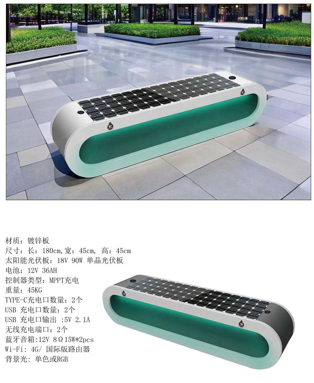 太陽能戶外座椅90W無線充電太陽能花園凳優(yōu)點: